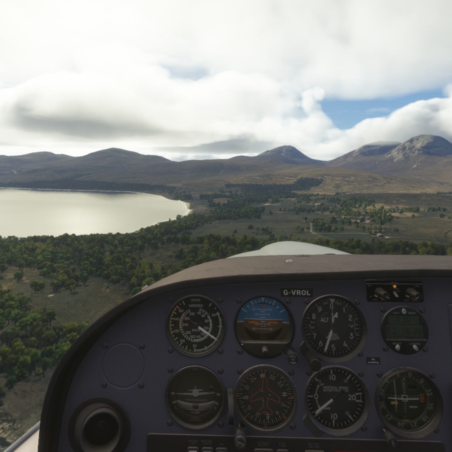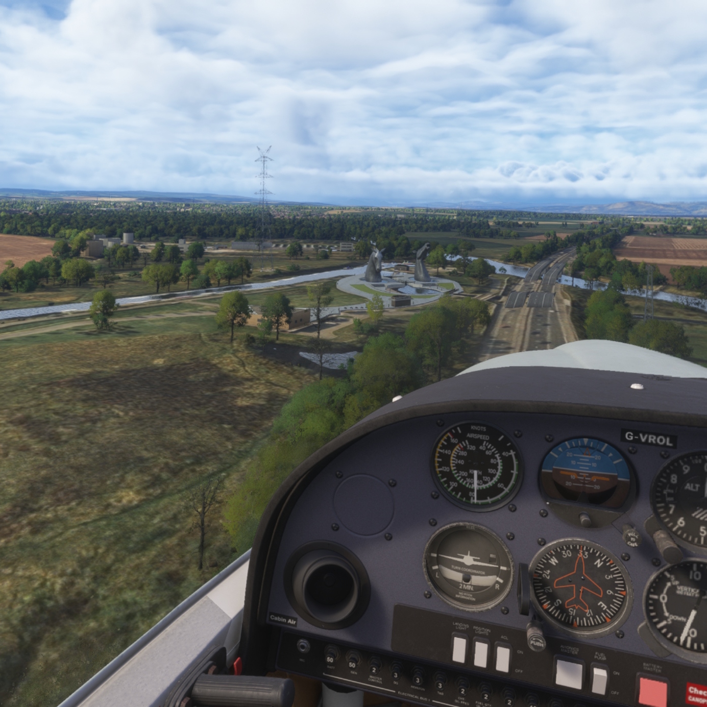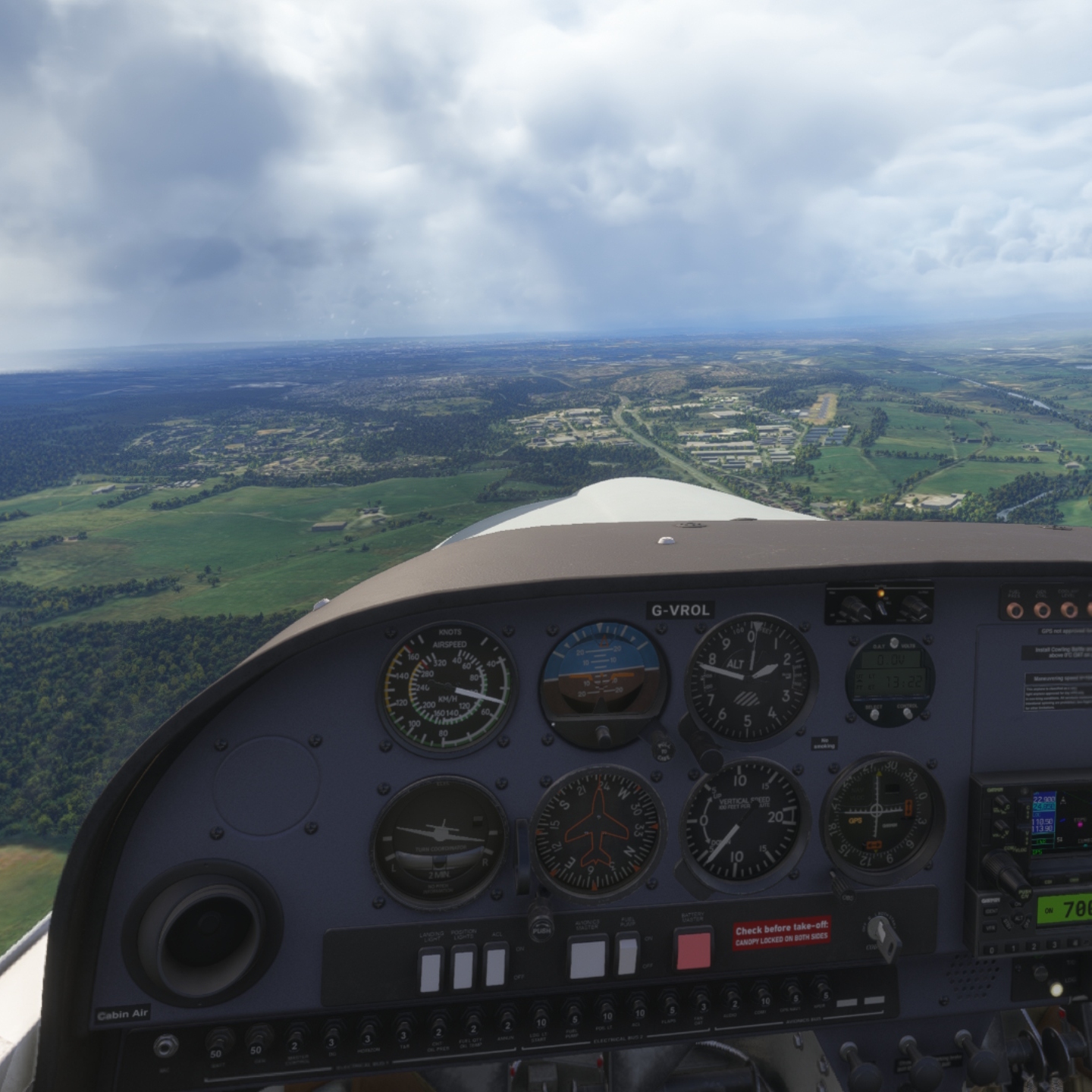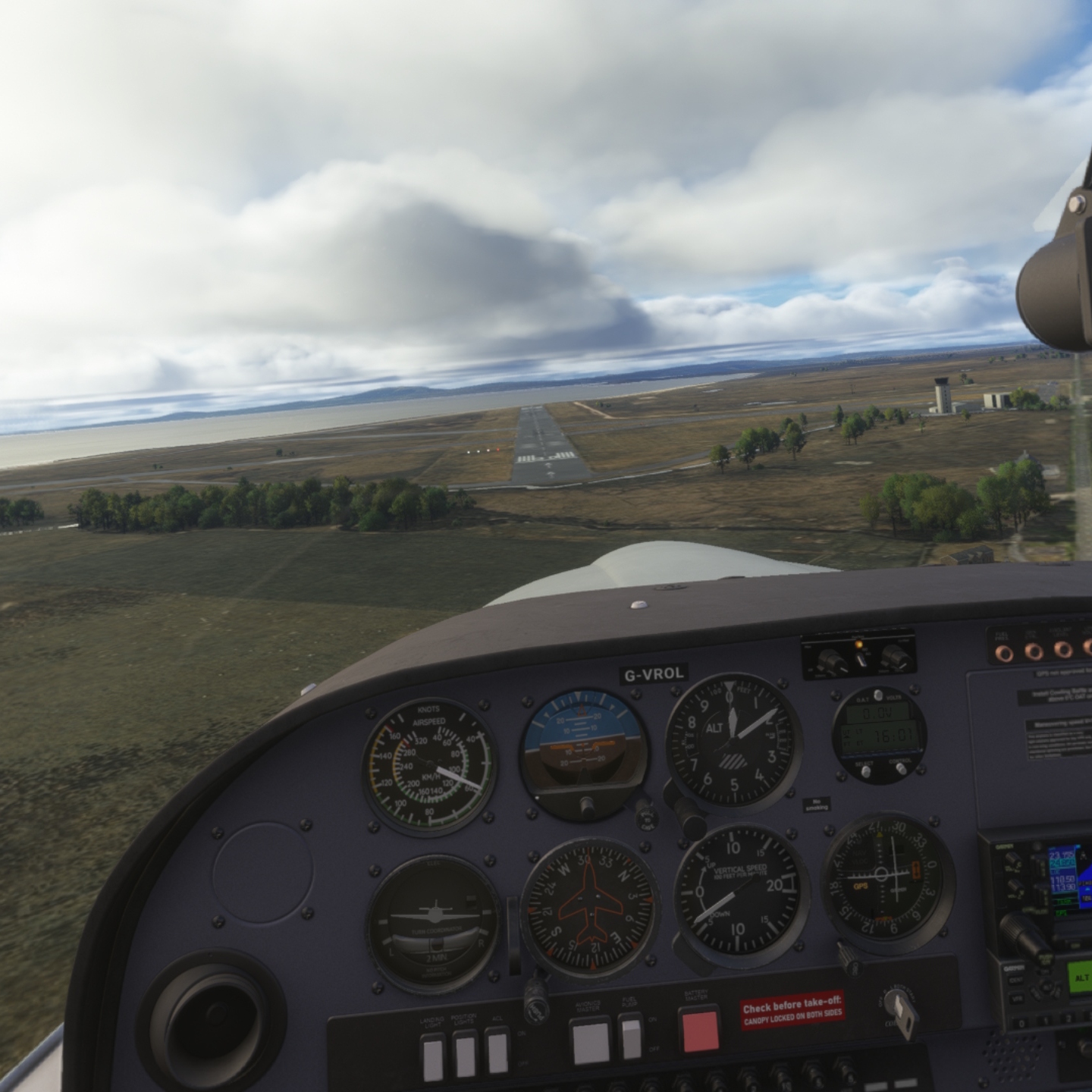 (If you're wondering, following the airspeed guage straight up to the horizontal gap in the trees around the centre of the image - this marks the end of the runway. The start of the runway is a little down where a small dirt road takes a 90 degree turn)